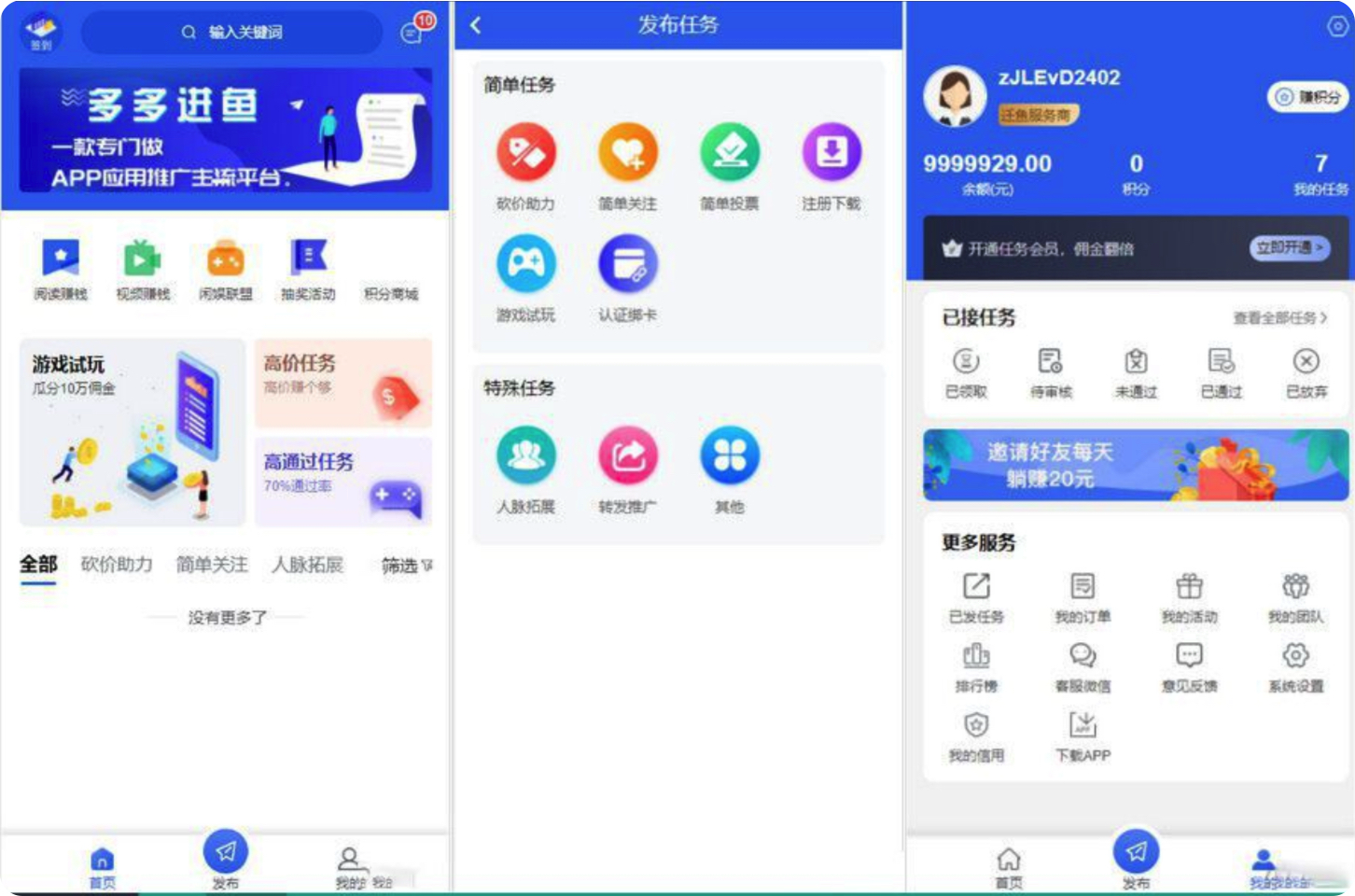 任务管理:包含平台的任务列表和用户任务列表,以及任务订单的相关管理。